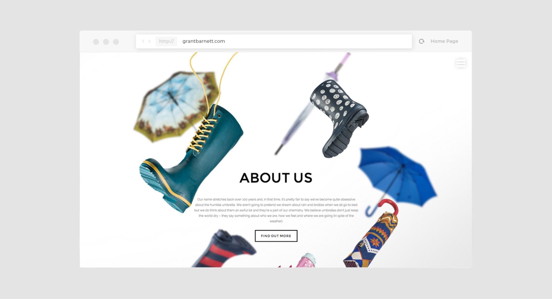 We presented the website designs to Grant Barnett who were very pleased and gave the immediate go-ahead to get cracking with developing the website itself. The finished site included lots of bold bright images of Grant Barnett's products that move in various ways as you interact with the site. Twirling umbrellas, falling welly boots and 360 degree rotations all go into making the site come alive.
